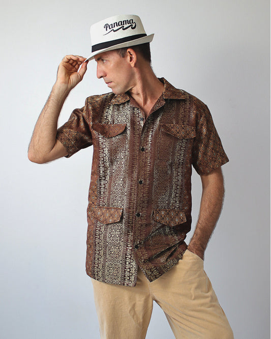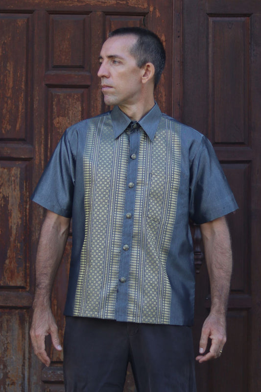 RaanPahMuang Formal Northern Thailand Woven Stitchwork Short Sleeve Silk Men Shirt