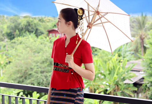 RaanPahMuang Muang Cotton Thai Ladies Shirt Handmade Silk Band Empire Bust Style