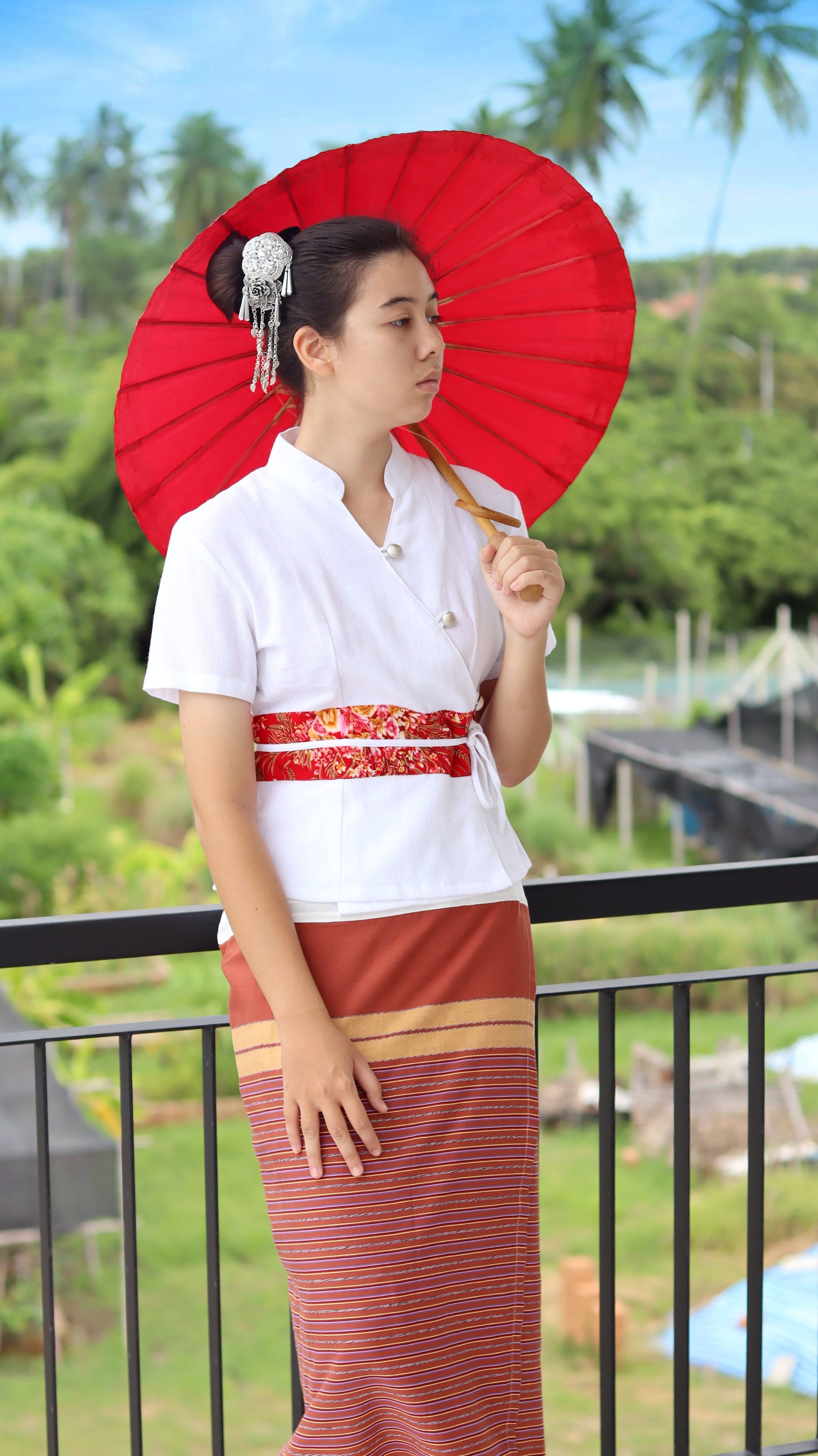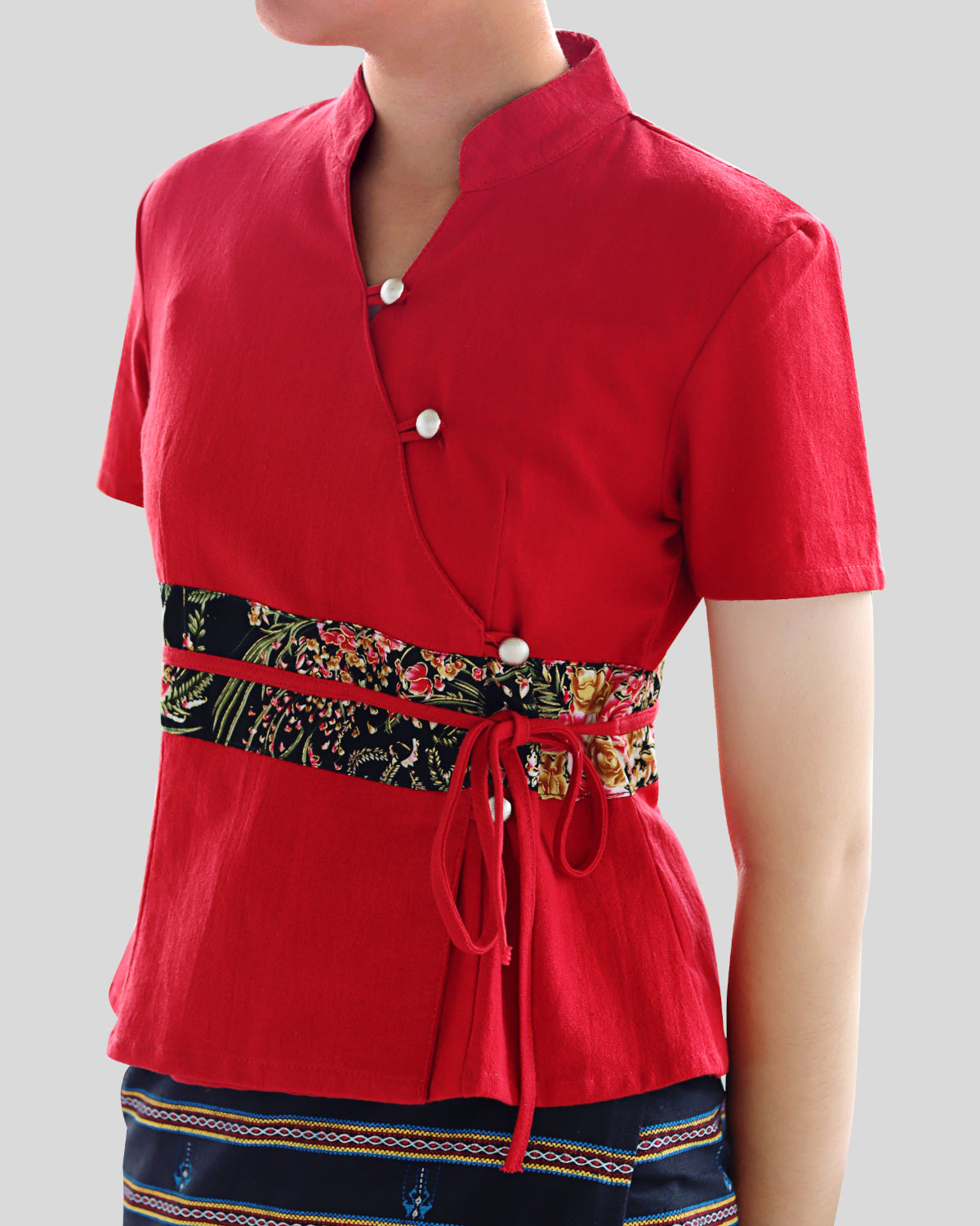 RaanPahMuang Muang Cotton Thai Ladies Shirt Handmade Silk Band Empire Bust Style